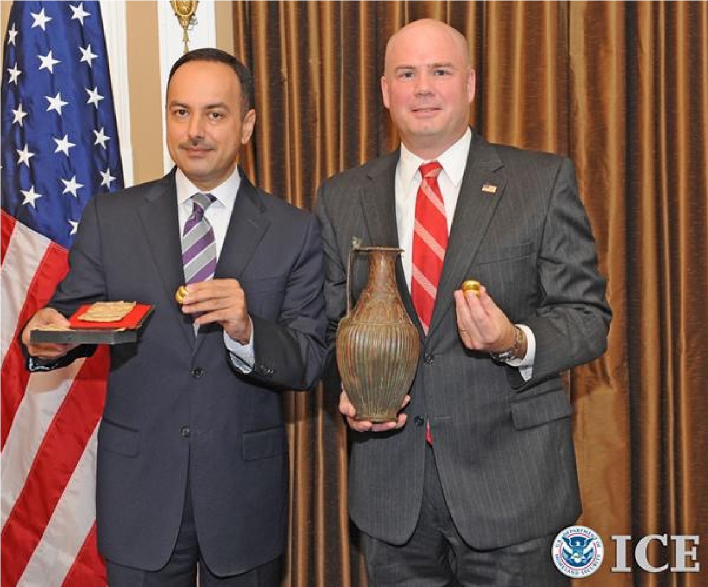 DHS relies heavily on a non-criminal court procedure known as forfeiture to vest government officials with legal title to seized artifacts so that the United States can send objects back to their countries of origin. Expressing support for this “seize and send” policy, former DHS Secretary Janet Napolitano proclaimed, “We will continue to work to ensure cultural artifacts and treasures that were stolen and entered this country illegally are recovered and returned to their rightful home nations.”[7] Immigration and Customs Enforcement’s (ICE) Cultural Property, Art, and Antiquities Program firmly embraces this mission, explaining on its website, “Returning a nation’s looted cultural heritage or stolen artwork, promotes goodwill with foreign governments and citizens, while significantly protecting the world’s cultural heritage and knowledge of past civilizations.”[8]